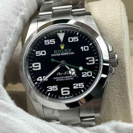 スーパーコピーロレックスエアキングは、軽やかな書体で記された「Air-King」の文字に、大きくはっきりと示されたアワーマーカーが特徴的な、パイロットの為のプロフェッショナルモデルです。