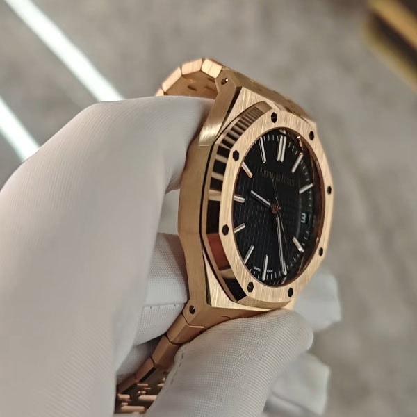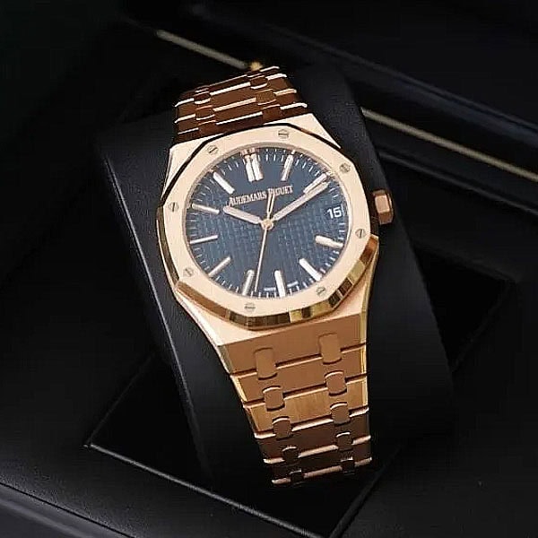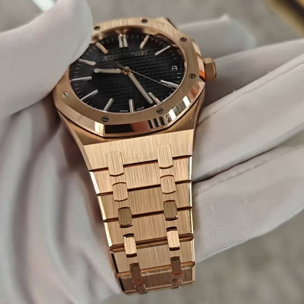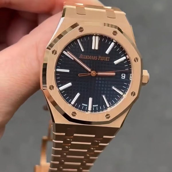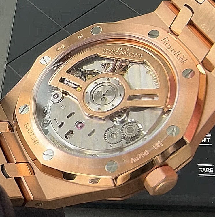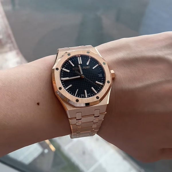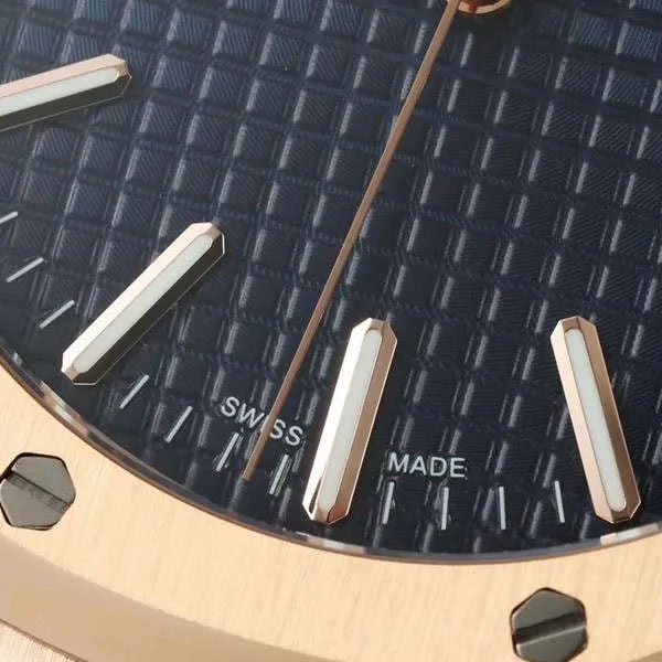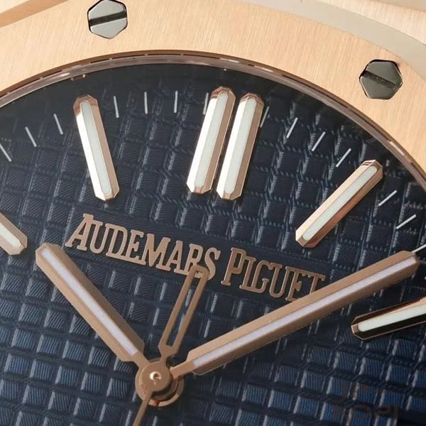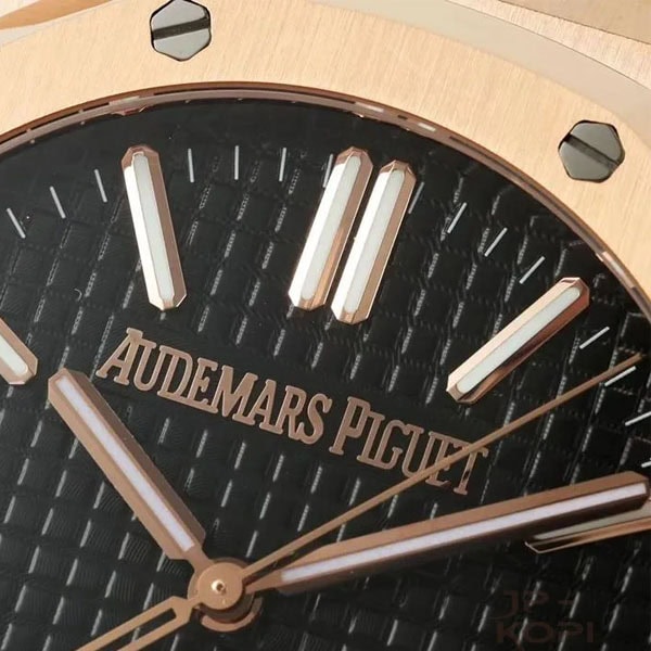 18kローズゴールドのアプライドアワーマーカーとロイヤルオーク針が採用されています。
