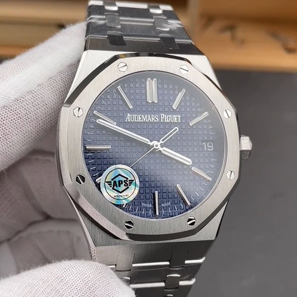 18Kホワイトゴールドのアプライドアワーマーカーとロイヤルオーク針が採用されています。