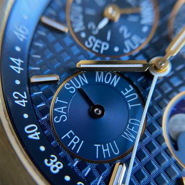 12時位置に月と閏年表示、3時位置にデイト、6時位置にムーンフェイズ、9時位置に曜日表示。