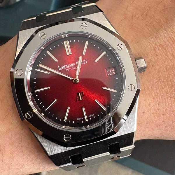 スモークバーガンディ カラーのダイヤルにサンバースト仕上げ、