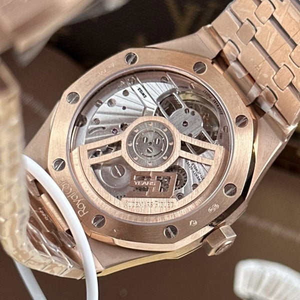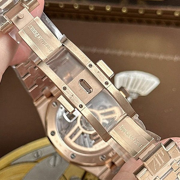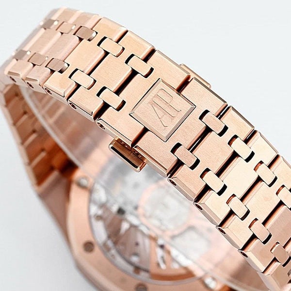 ピンクゴールド製のアプライドアワーマーカーと蓄光塗料が塗布されたロイヤルオーク針が配されています。