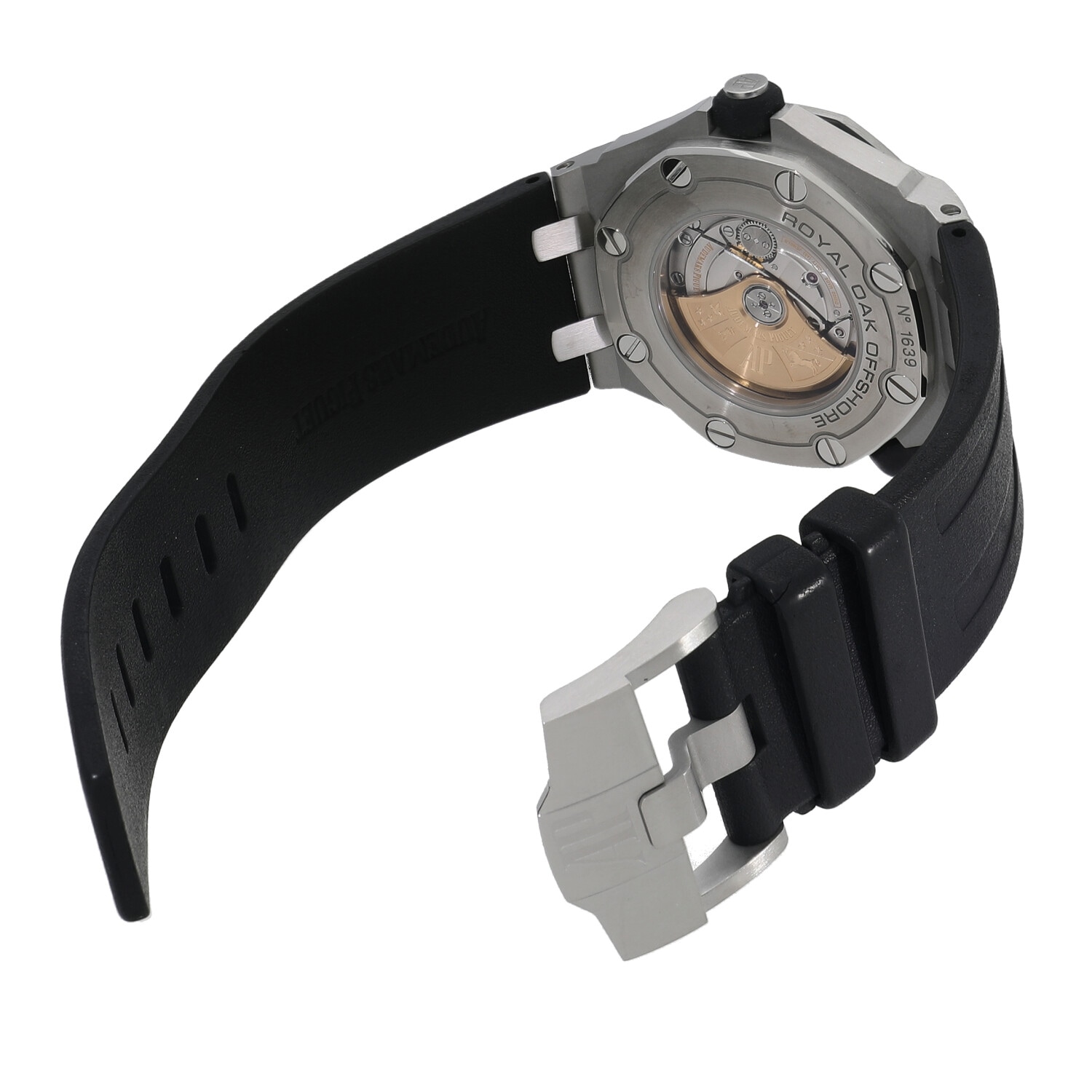 ステンレススティール製ピンバックルが付属したブラック・ラバーストラップ。