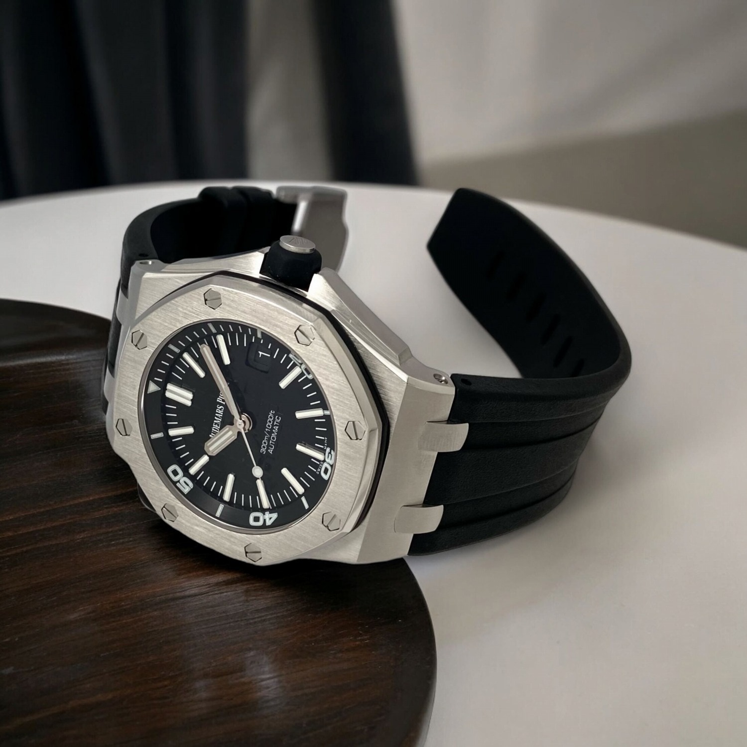 ホワイトゴールドのアップライドアワーマーカーと蓄光処理を施したロイヤル オーク針(ブラックの分針)