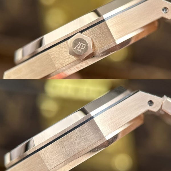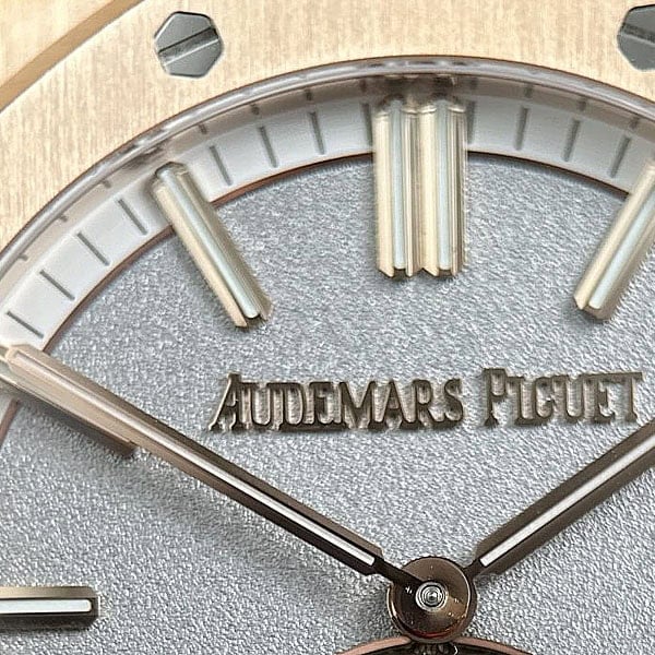 蓄光塗料が塗布されたピンクゴールドのアプライドアワーマーカーとロイヤルオーク針が採用されています。