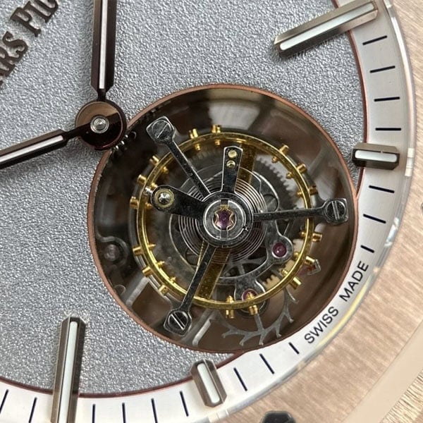 本物の機能とも100%完全一致、6時位置の窓からトゥールビヨンを眺められるようになっています。