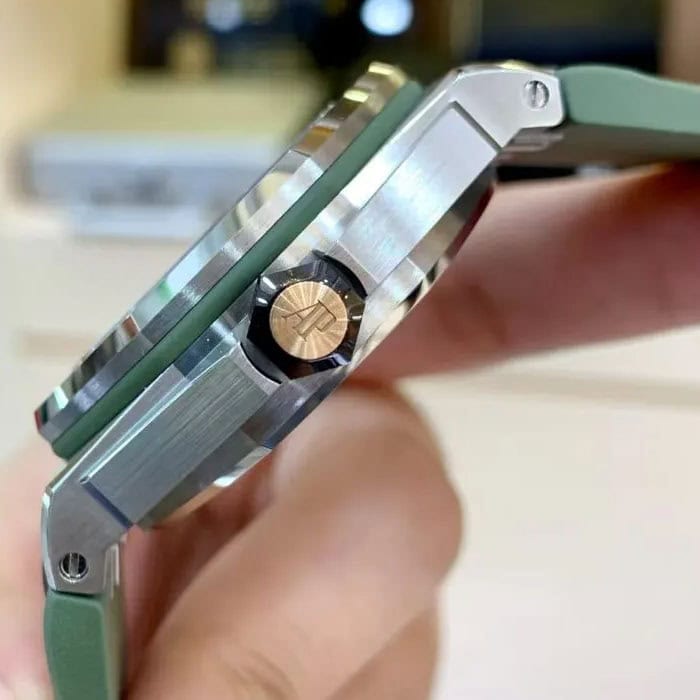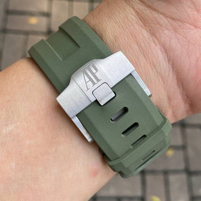 文字盤:メガタペストリー模様のカーキグリーンダイヤル蓄光処理を施したピンクゴールドのアプライドアワーマーカーとロイヤルオーク針