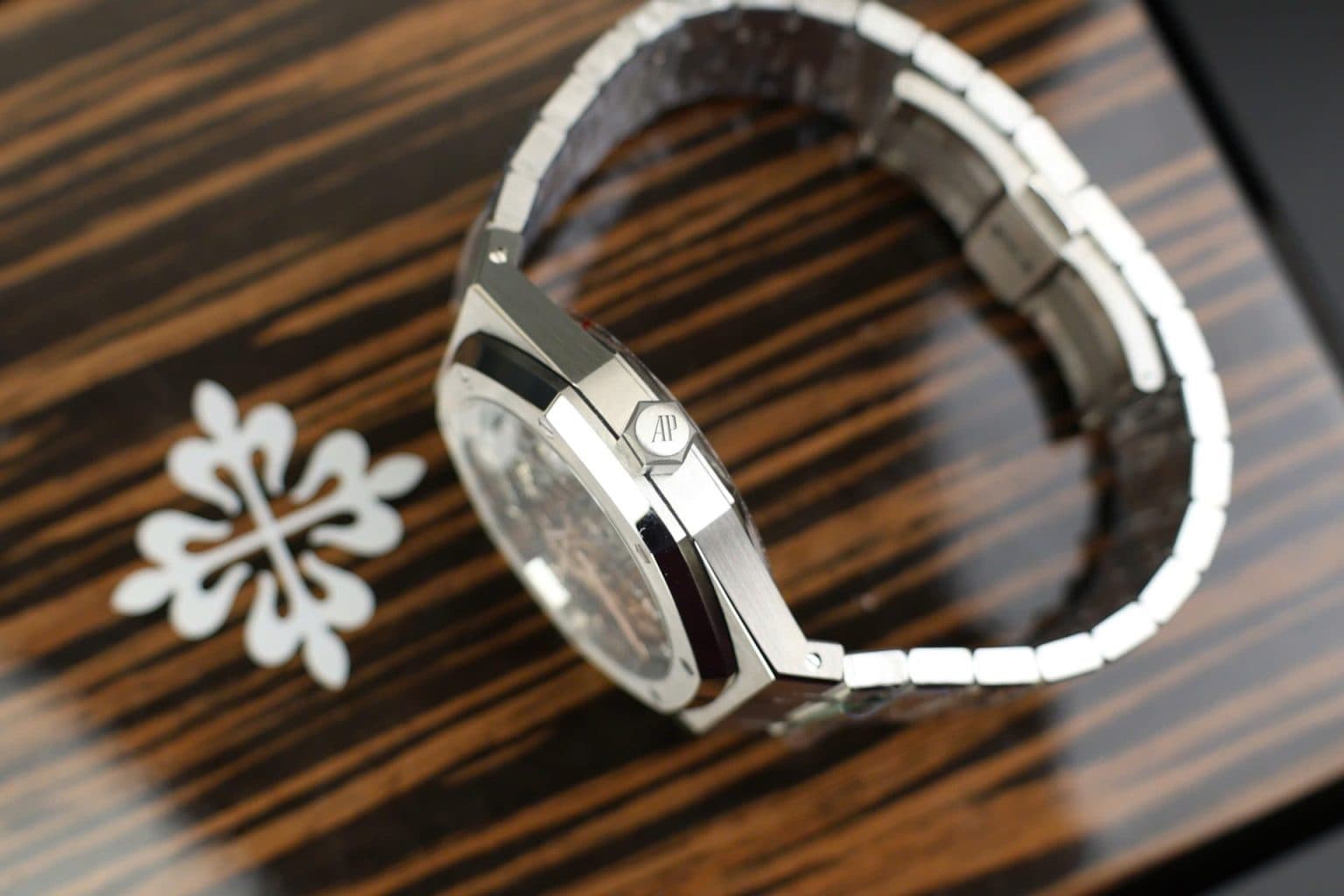 文字盤:スレートグレーダイヤル、オープンワーク、蓄光 処理を施したピンクゴールドのアプライドアワ ーマーカーとロイヤルオーク針