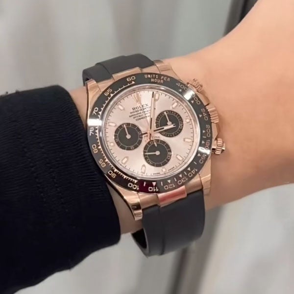 文字盤:ローズゴールド文字盤とブラックサブダイヤル、スティックマーカーと相まって、