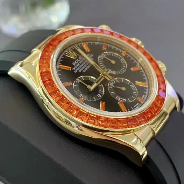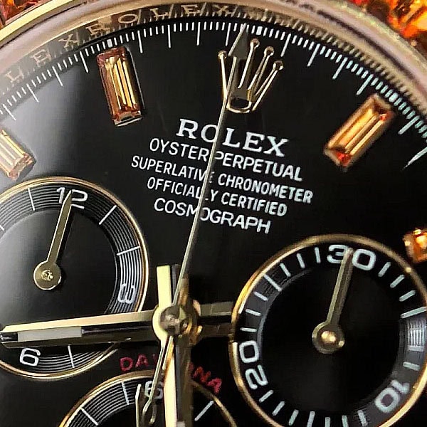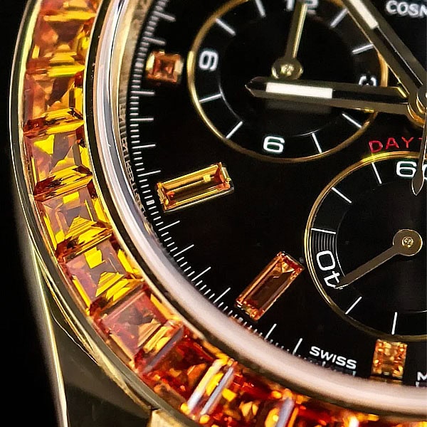 文字盤:文字盤インデックスに11個のバケットカットカラーサファイアをセットあらゆるレーザーテキスト、プリント、刻印の精度がロレックス正規品と見分けがつけないことを確保しております。