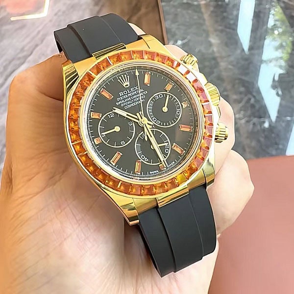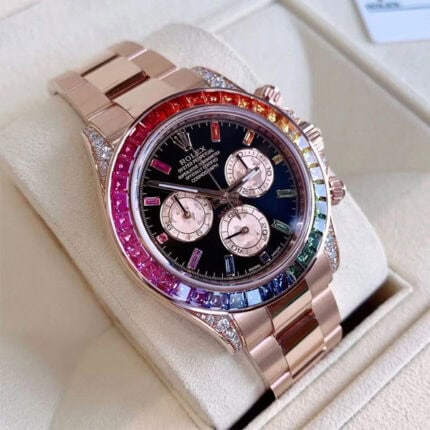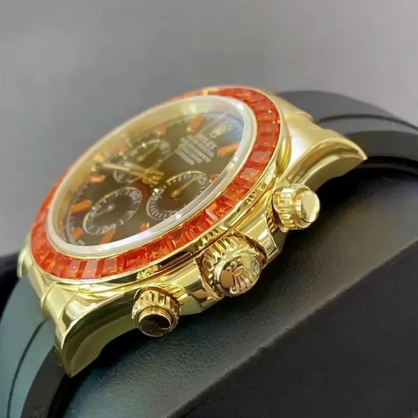 さらに文字盤、ラグ、ケースサイド、にもダイヤモンドを配したラグジュアリー仕様のデイトナコピー時計です。