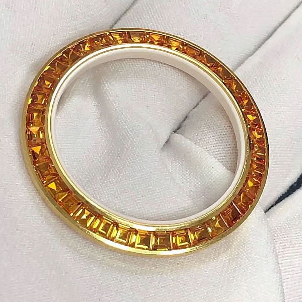 ベゼル:ベゼルに36個、文字盤インデックスに11個のバケットカットカラーサファイアをセット