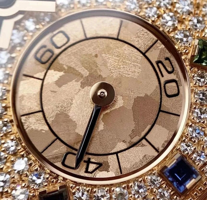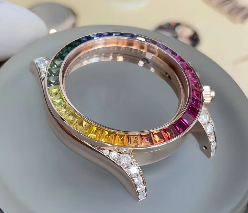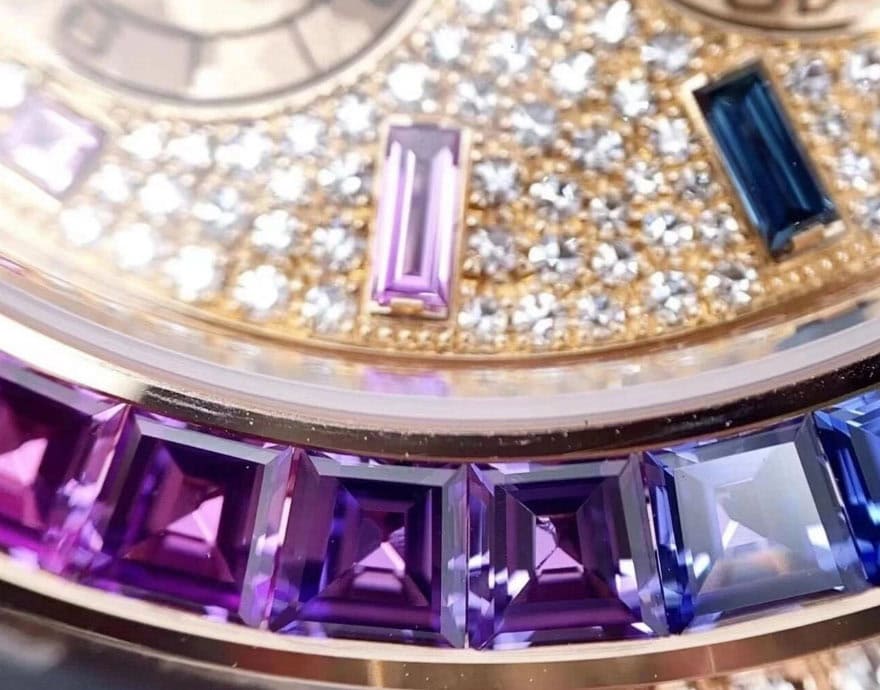 文字盤:文字盤インデックスに11個のバケットカットカラーサファイアをセット