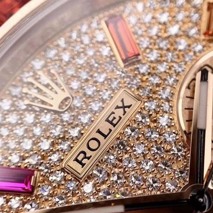 さらに文字盤、ラグ、ケースサイド、にもダイヤモンドを配したラグジュアリー仕様のデイトナコピー時計です。