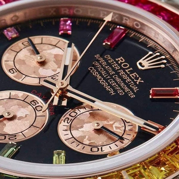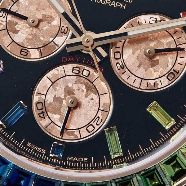 文字盤:文字盤インデックスに11個のバケットカットカラーサファイアをセット