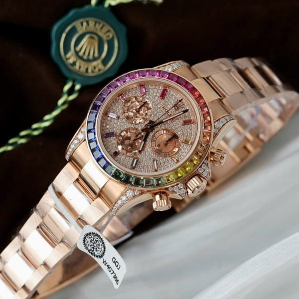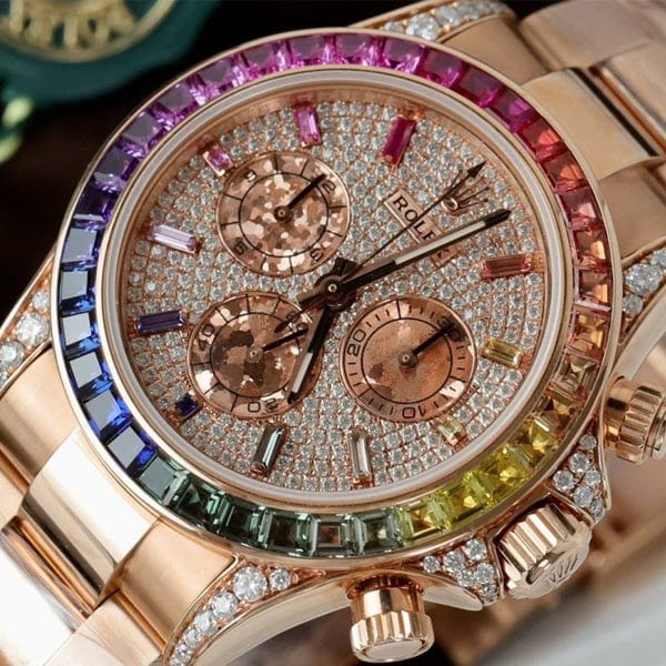 さらに文字盤、ラグ、ケースサイド、にもダイヤモンドを配したラグジュアリー仕様のデイトナコピー時計です。