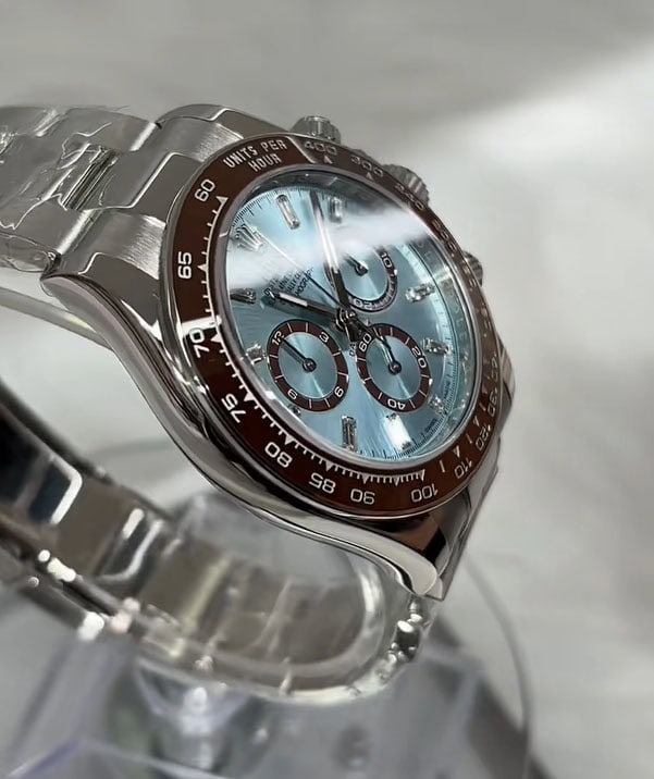 チェスナット ブラウンのモノブロック セラクロム ベゼルにはタキメーター目盛りを刻まれており、