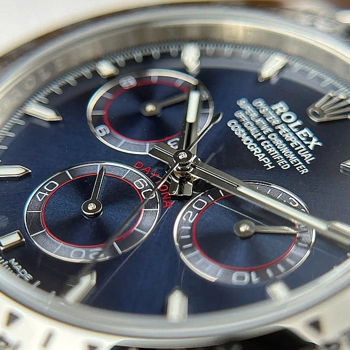 ベゼルには黒くコーティングされた数字と目盛りが刻まれたタキメータースケールが備わっています。