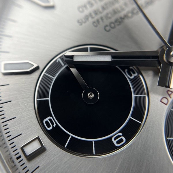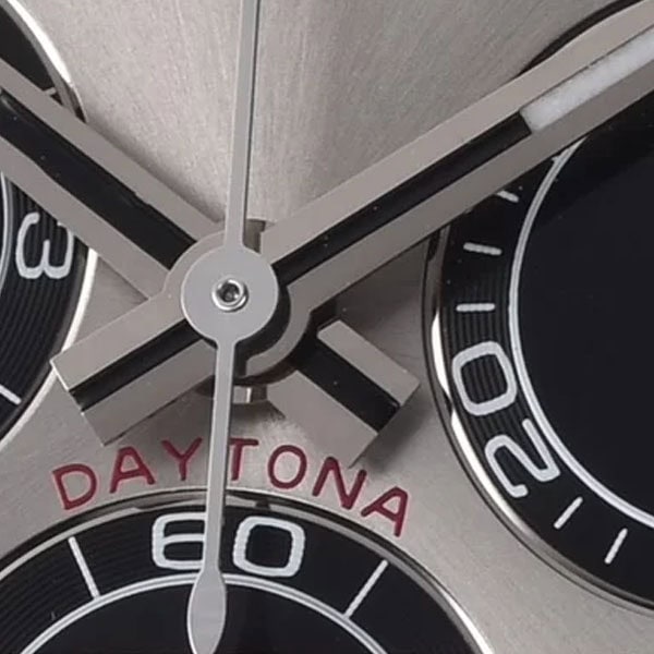 文字盤:ニューグレーパンダスチール文字盤はブラックサブダイヤルとスティックマーカーを備えており、