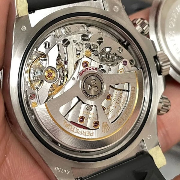 ロレックスのバージョン4131ムーブメントのように、象徴的なコート・ド・ジュネーブストライプを見ることができます。
