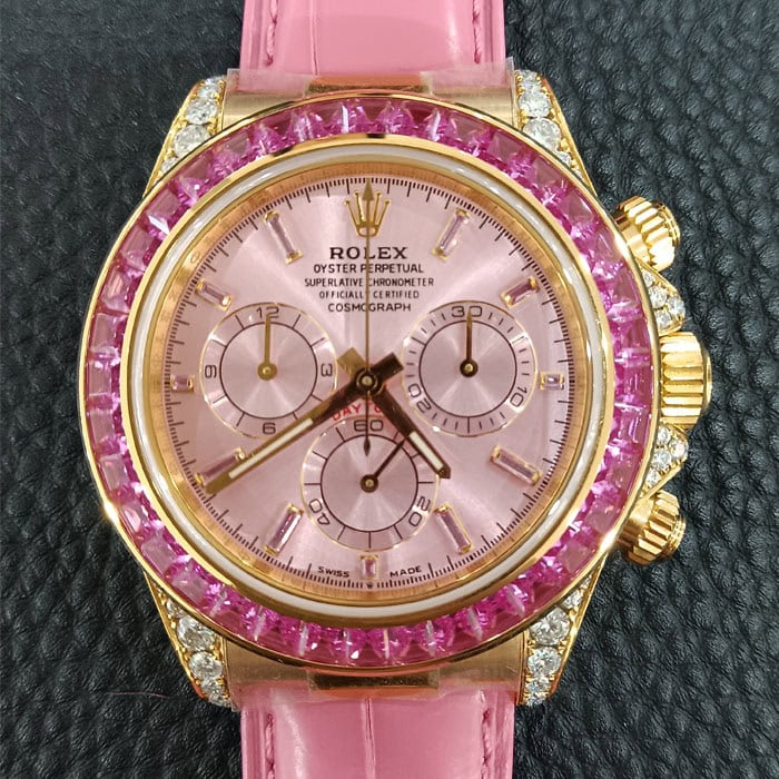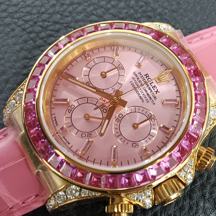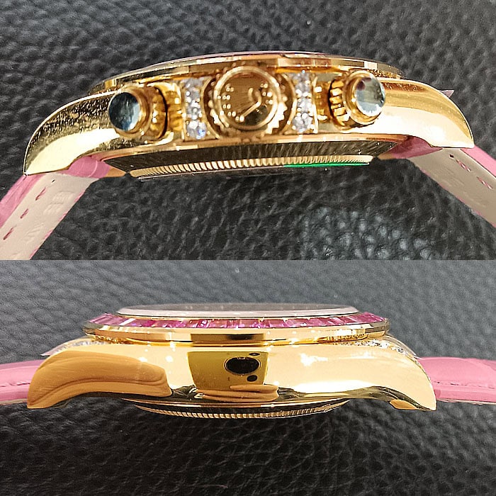 ラグ、ケースサイド、にもダイヤモンドを配したラグジュアリー仕様のデイトナコピー時計です。