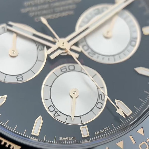 文字盤:ブラック文字盤とローズゴールドサブダイヤル、スティックマーカーと相まって、