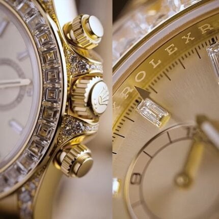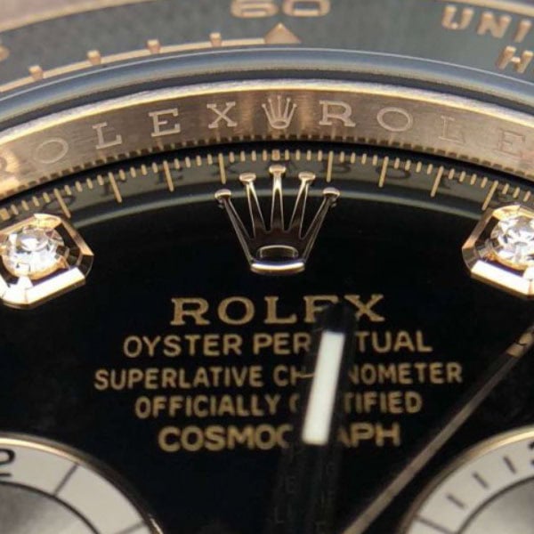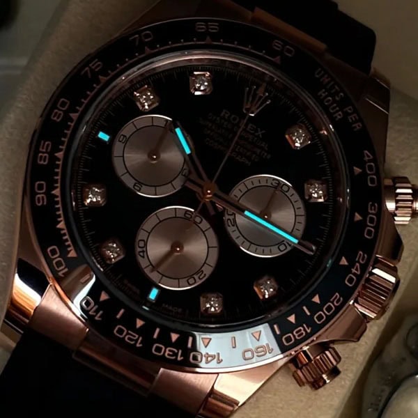 文字盤:ブラック文字盤とゴールデンのサブダイヤル、モアサナイトダイヤモンドのマーカーが相まって、
