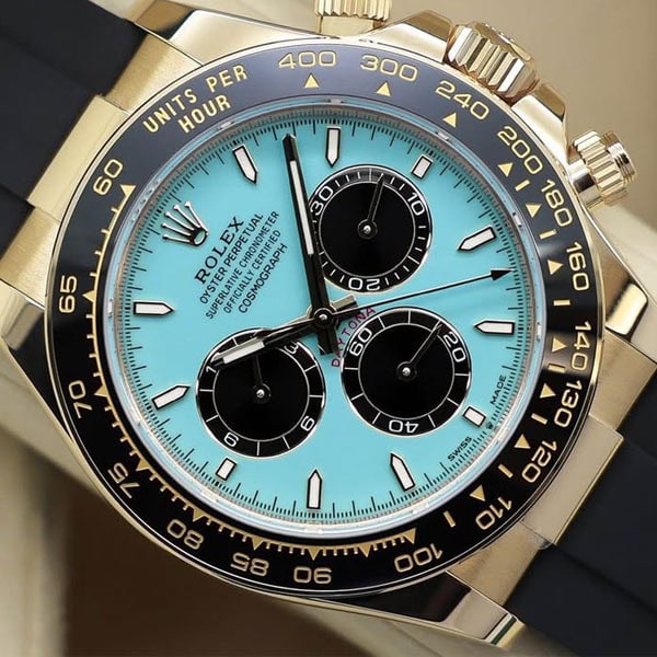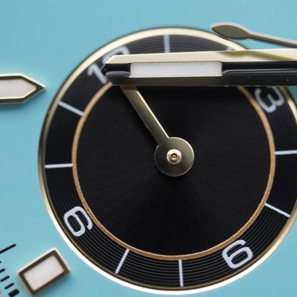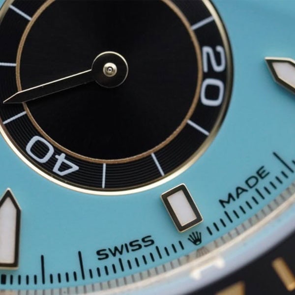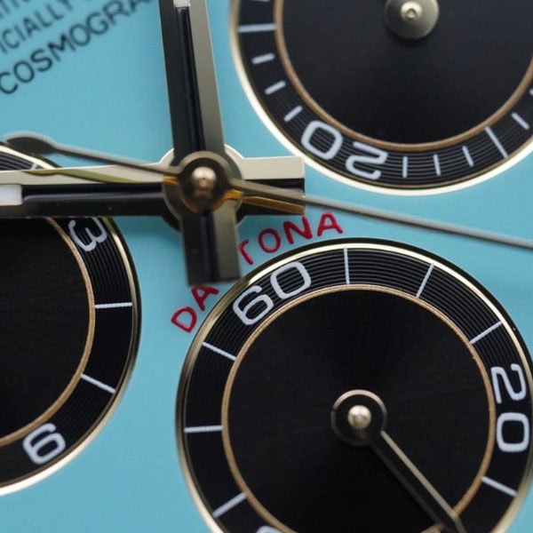 文字盤: ターコイズブルーとブラックの文字盤には、スネイル仕上げのカウンター