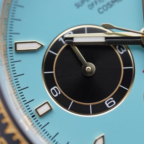 文字盤:ターコイズブルーとブラックダイアルには、18 ct ゴールドのアワーマーカーと、