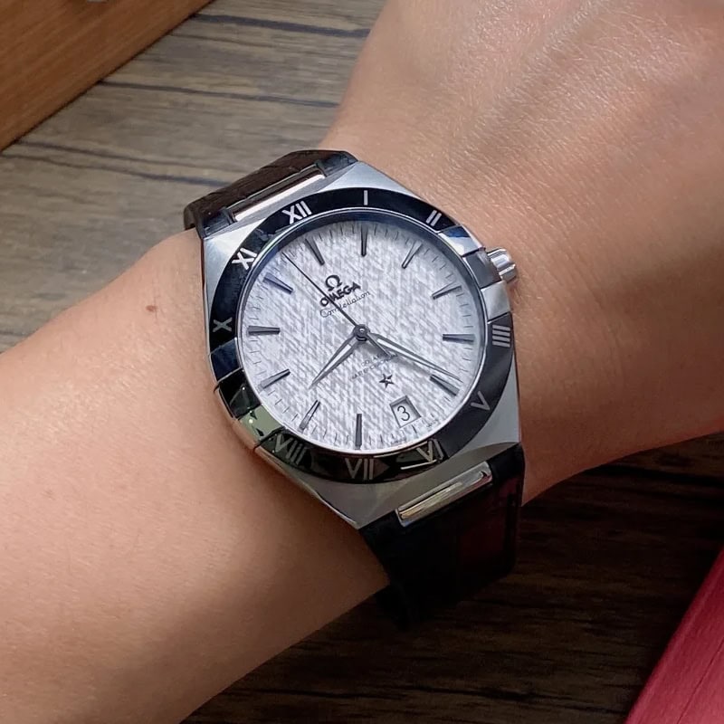 針、オメガロゴ、コンステレーションの「星」、ファセット加工のインデックスには全てロジウムプレート加工が施されています。
