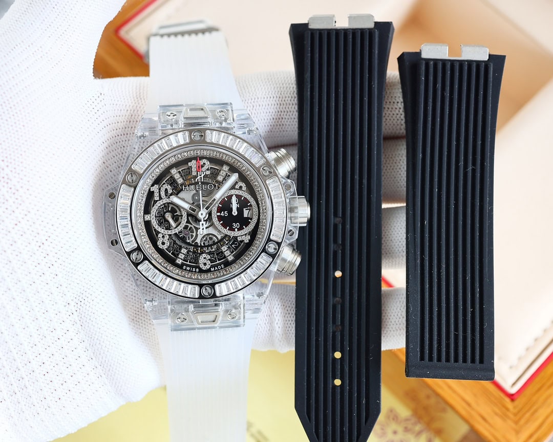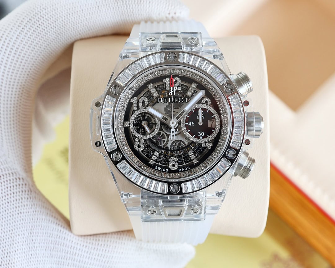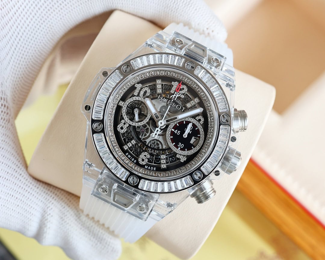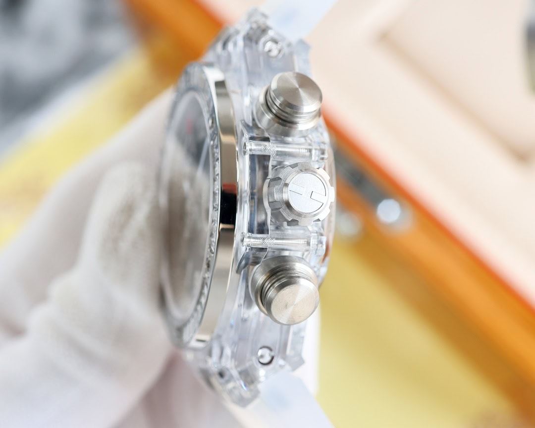 この時計は、サファイアクリスタル製のケースが特徴で、