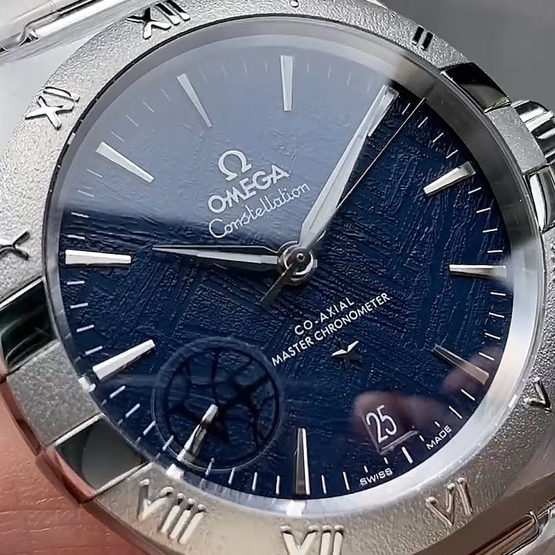 美しいダイアルは本物の鉄隕石(アイアン メテオライト)から形成され、ブルーのコーティングが施されています。