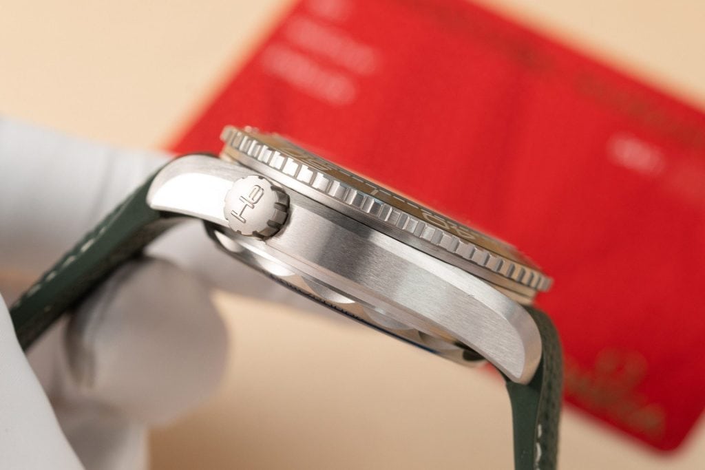 43.5mmサイズのこのモデルは、サテン仕上げのステンレススティール製。サテン仕上げのブラックセラミック製ベゼルリングと、リキッドメタル™製ダイビングスケールを備えています。“ガンメタル”グレーのガルバニック加工を施したサンドブラスト仕上げのダイアルには、3時位置に日付表示が配され、ベージュとホワイトの文字が転写されています。オメガのロゴ、アラビア数字、針、そしてインデックスはブラッシュ仕上げのPVDステンレススティール製で、ベージュのスーパールミノヴァが暗い場所でも視認性を確保します。