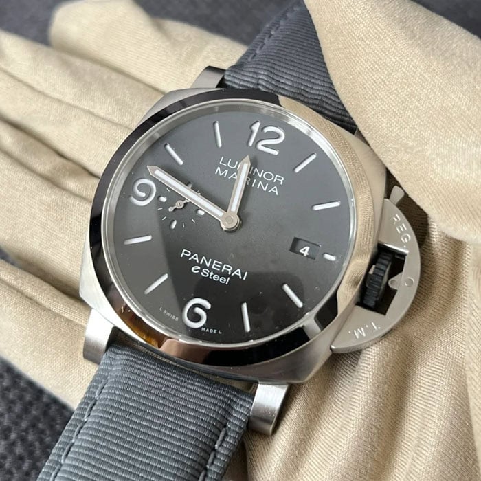 直径44mmのケースは存在感がありながら、パネライらしい品格を持ち合わせています。
