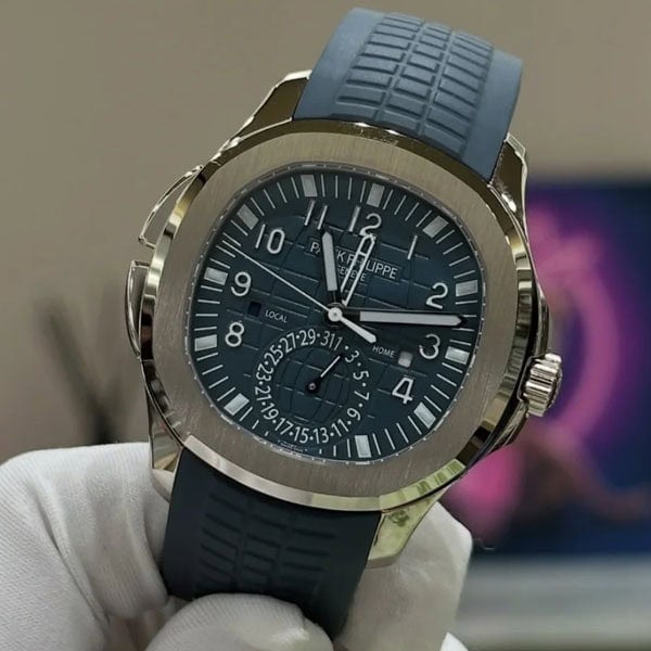 ブルーグレー・オパーリン文字盤には、アクアノート・コレクションの象徴的な装飾が施されています。