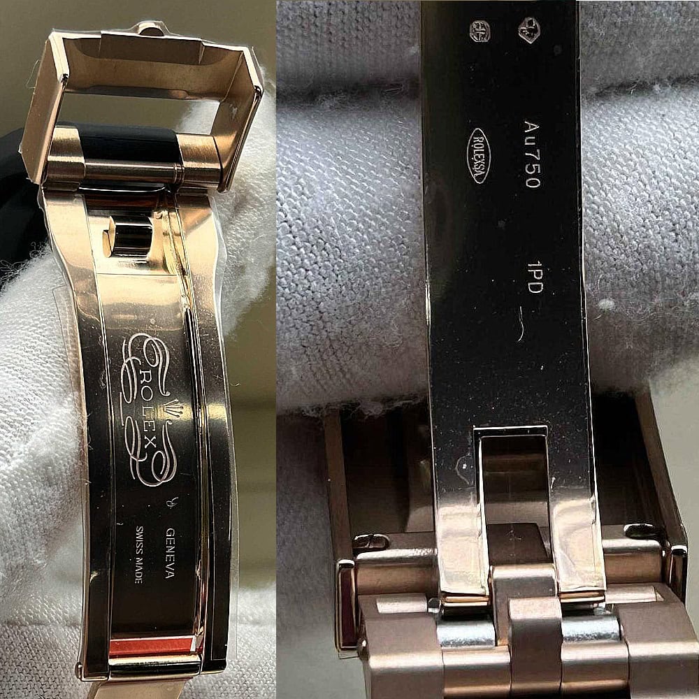ベゼル:18K ゴールド加工を施されたソリッド 904L ステンレススチールで作り出されたベゼルは、セラミックのマットブラック セラクロム インサートを誇っています。120 クリックの双方向回転機能と 60 分の目盛を備えています。盛り上がったポリッシュ仕上げ目盛りとサンドブラスト仕上げが時計の上品さを引き出します。数字と目盛りには18Kローズゴルードコーティングを施されております。刻印とデザインが100%正規品と同じです。