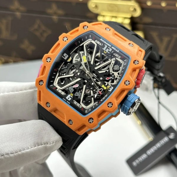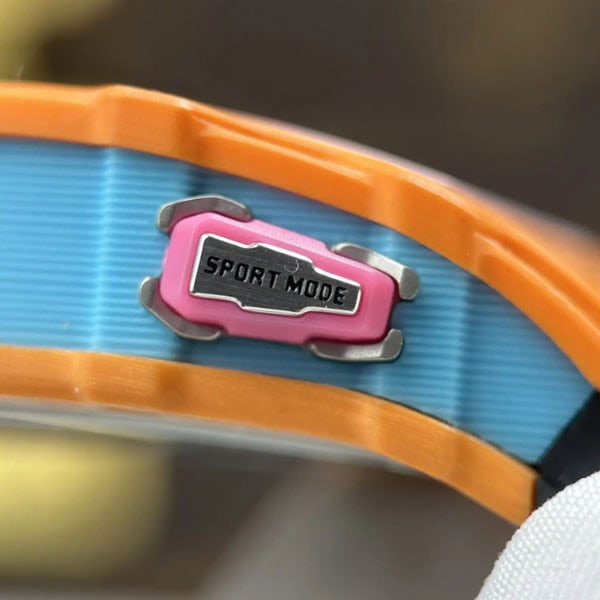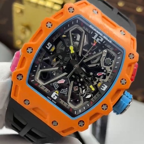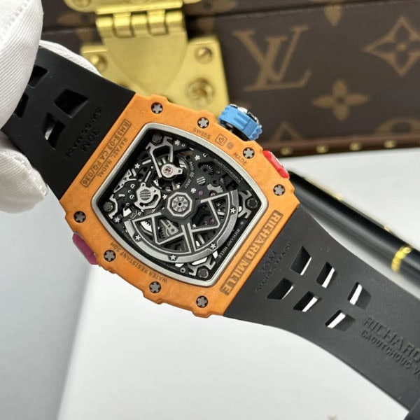 この時計は、魅力的なサルモンカラーのクォーツTPTとカーボンTPTケースで作られたRM 35-03