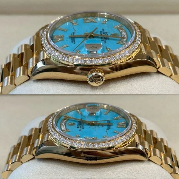 文字盤:ターコイズの文字盤と、ベゼル・インデックスにセッティングされたダイヤモンド