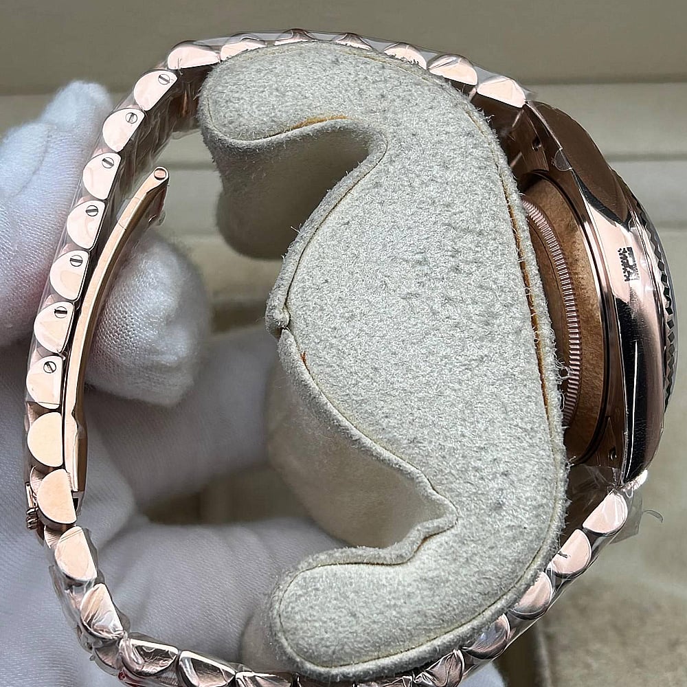 ベルト:半円形の3列リンクのプレジデントブレスレットは18Kローズゴールドコーティングされた904Lステンレススチールで作られており、DLCスクラッチプロテクションコーティングが施されています。しっかりとしたネジ山で簡単にベルト調整が可能です。また、コンシールド・クラウン・クラスプを備え、素早く快適にベルトを装着できることを確保しています。