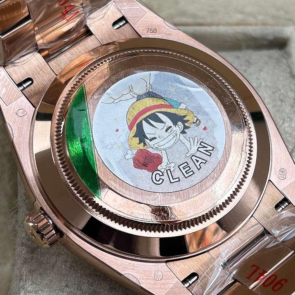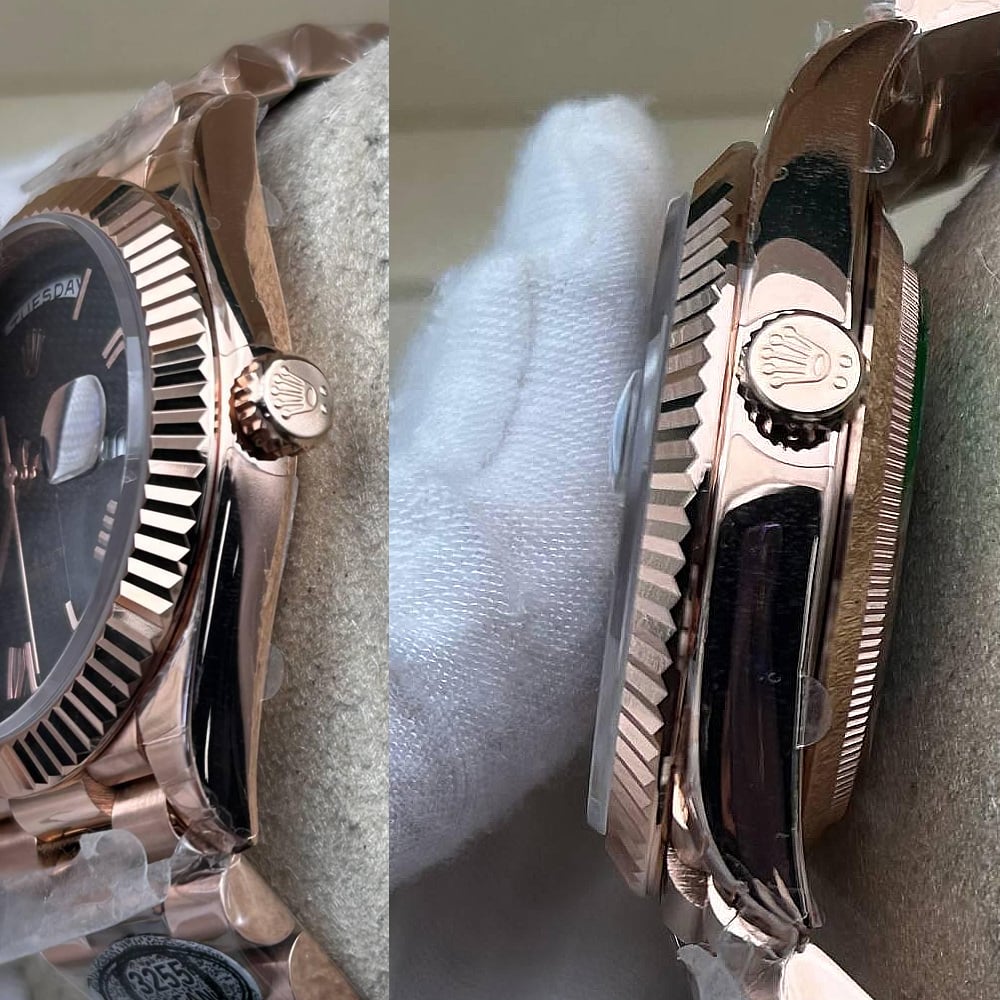 ケース:40mmのオイスターケースはロレックスのオイスタースチールにマッチし、ソリッドな904Lステンレススチールのモノブロック構造の上に18kローズゴールドコーティングを5層施して作られています。スクリュー式のケースバックとねじ込み式リューズを備え、Rehautリングには「ROLEX ROLEX」のレーザー刻印が施されてい ます。寸法はオリジナルのロレックスとまったく同じです。