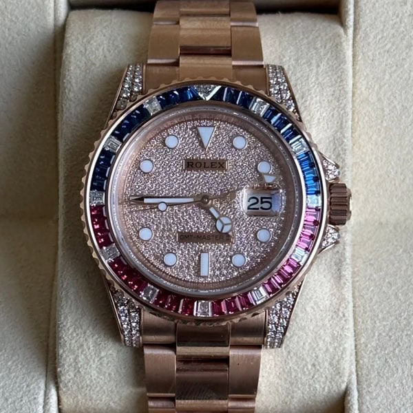 ベゼル:ベゼルは回転ベゼルです。バゲットカットされたダイヤモンド、ルビー、サファイアがセッティングされており、