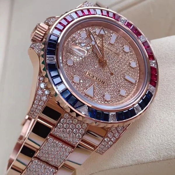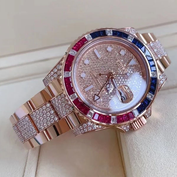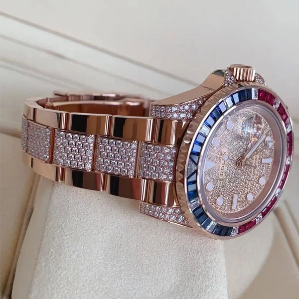ベゼル:ベゼルは回転ベゼルです。バゲットカットされたダイヤモンド、ルビー、サファイアがセッティングされており、