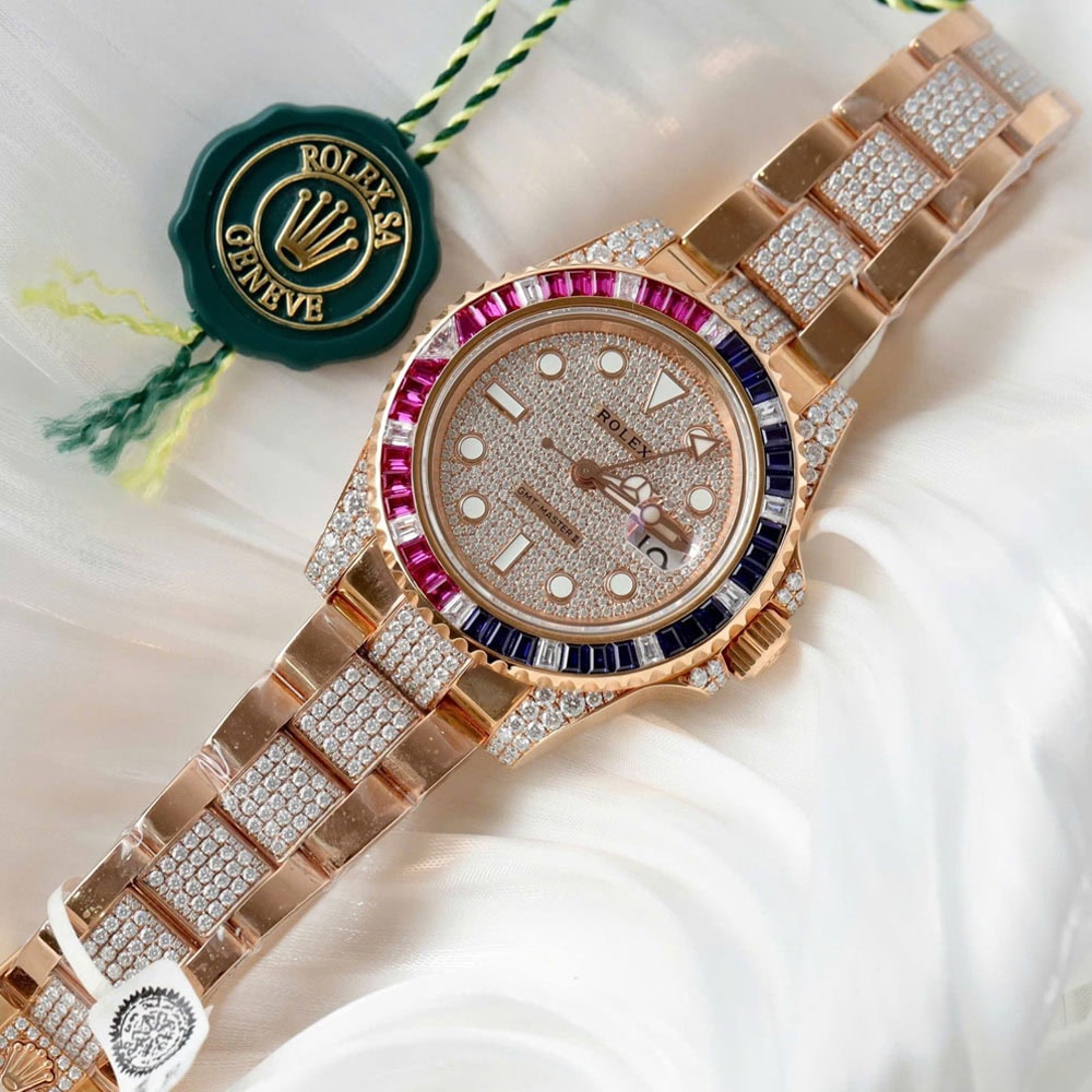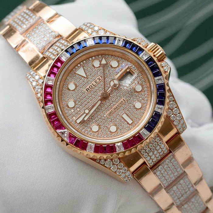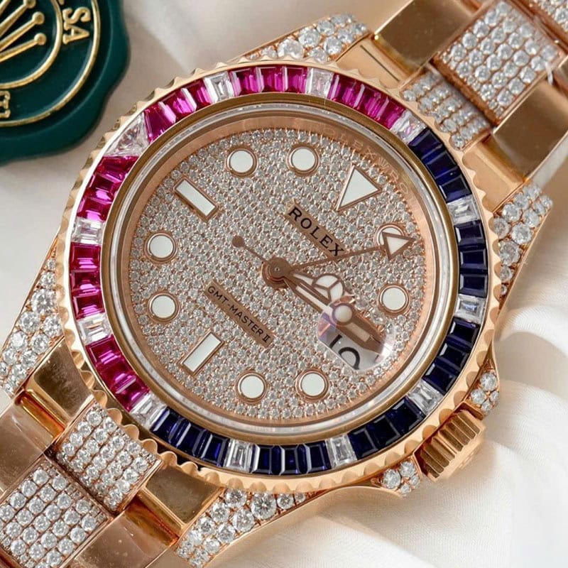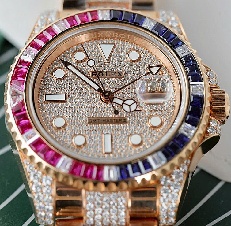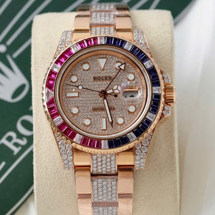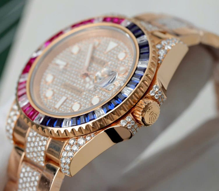ベゼル:ベゼルは回転ベゼルです。バゲットカットされたダイヤモンド、ルビー、サファイアがセッティングされており、