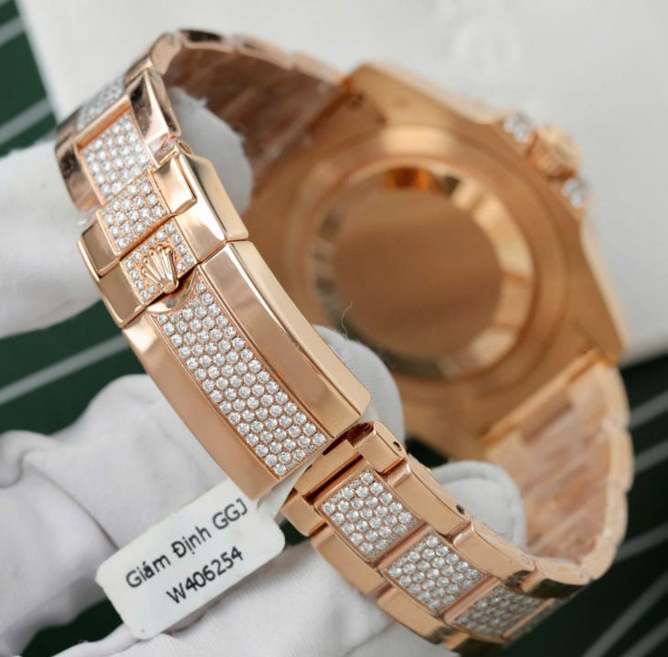 文字盤、ラグ、リューズガード、ブレスレットにもダイヤモンドがあしらわれています。