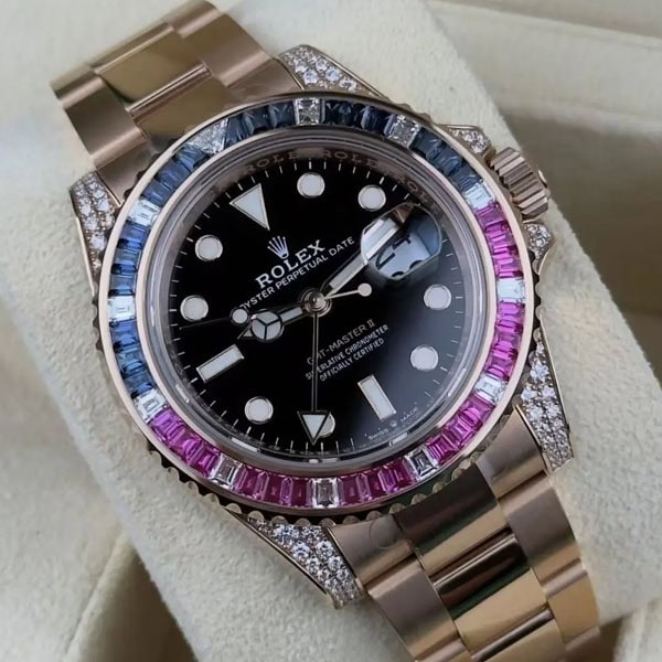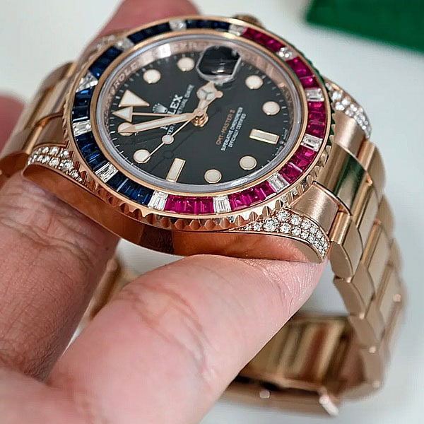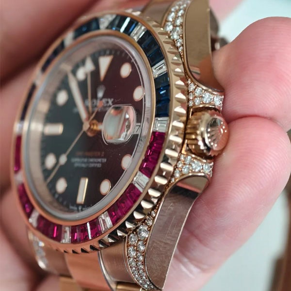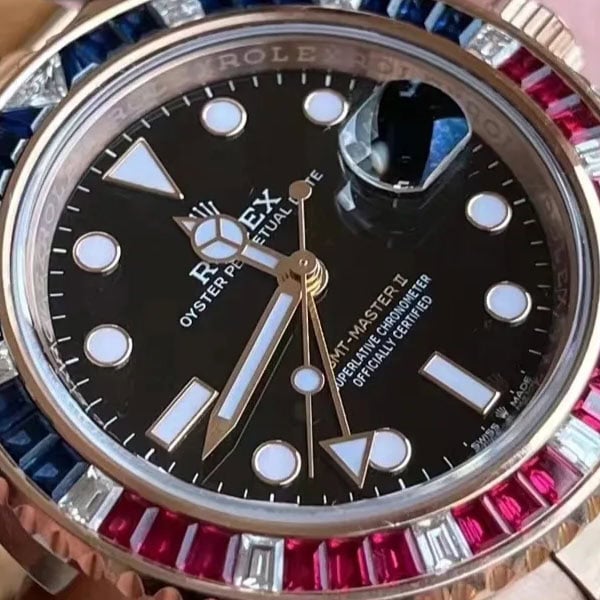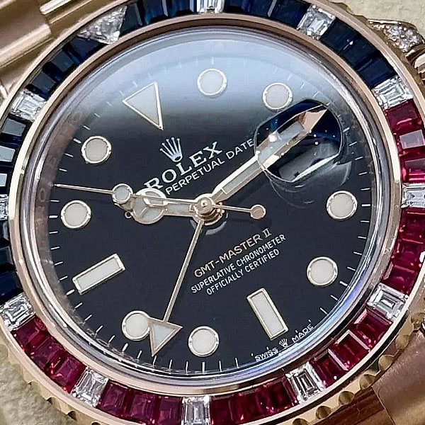 ベゼル:ベゼルは回転ベゼルです。バゲットカットされたダイヤモンド、ルビー、サファイアがセッティングされており、