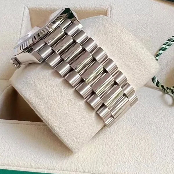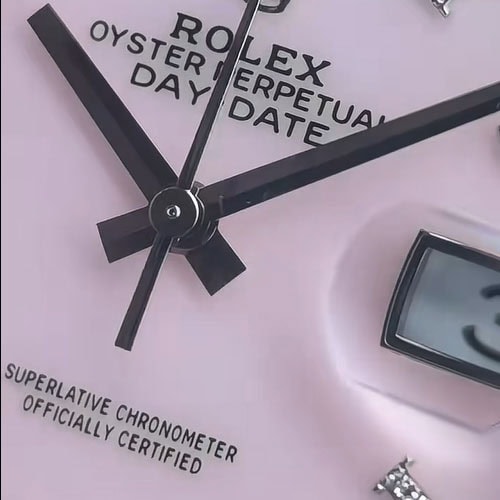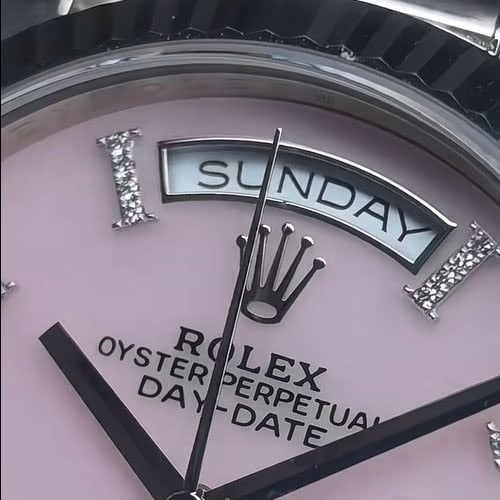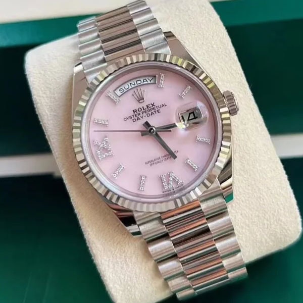 このピンクオパールダイヤルは珍しいカラーで、デイデイトの伝統的な美しさに現代的な解釈を加えています。