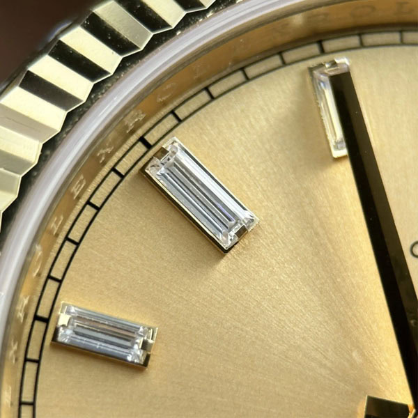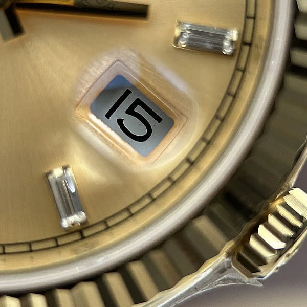 正しいデイトフォントとサイズを採用しており、アワーマーカーと針に施された18Kイエローゴールドコーティングは色落ちを防ぐできるのみならず、