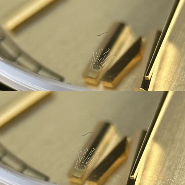 正しいデイトフォントとサイズを採用しており、アワーマーカーと針に施された18Kイエローゴールドコーティングは色落ちを防ぐできるのみならず、