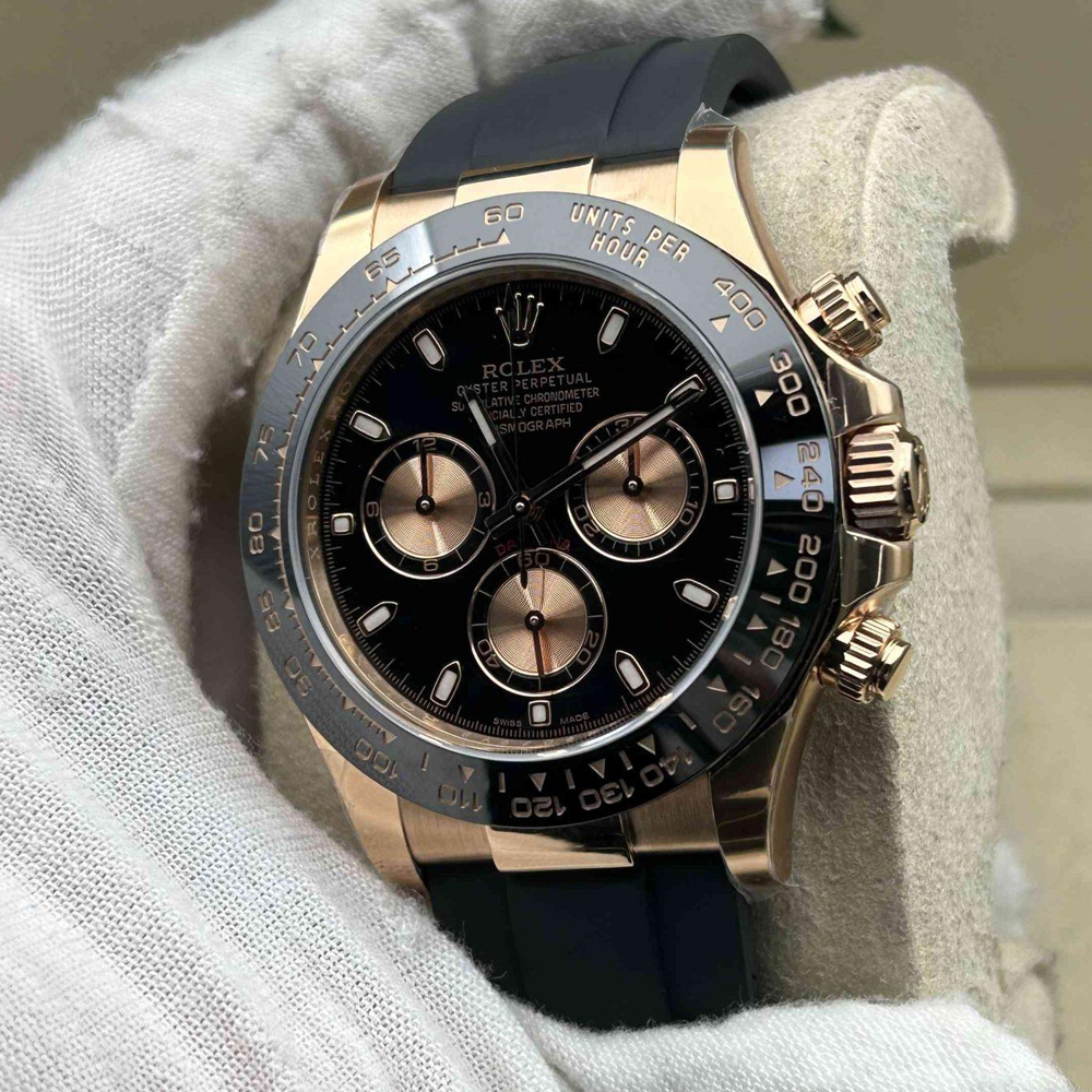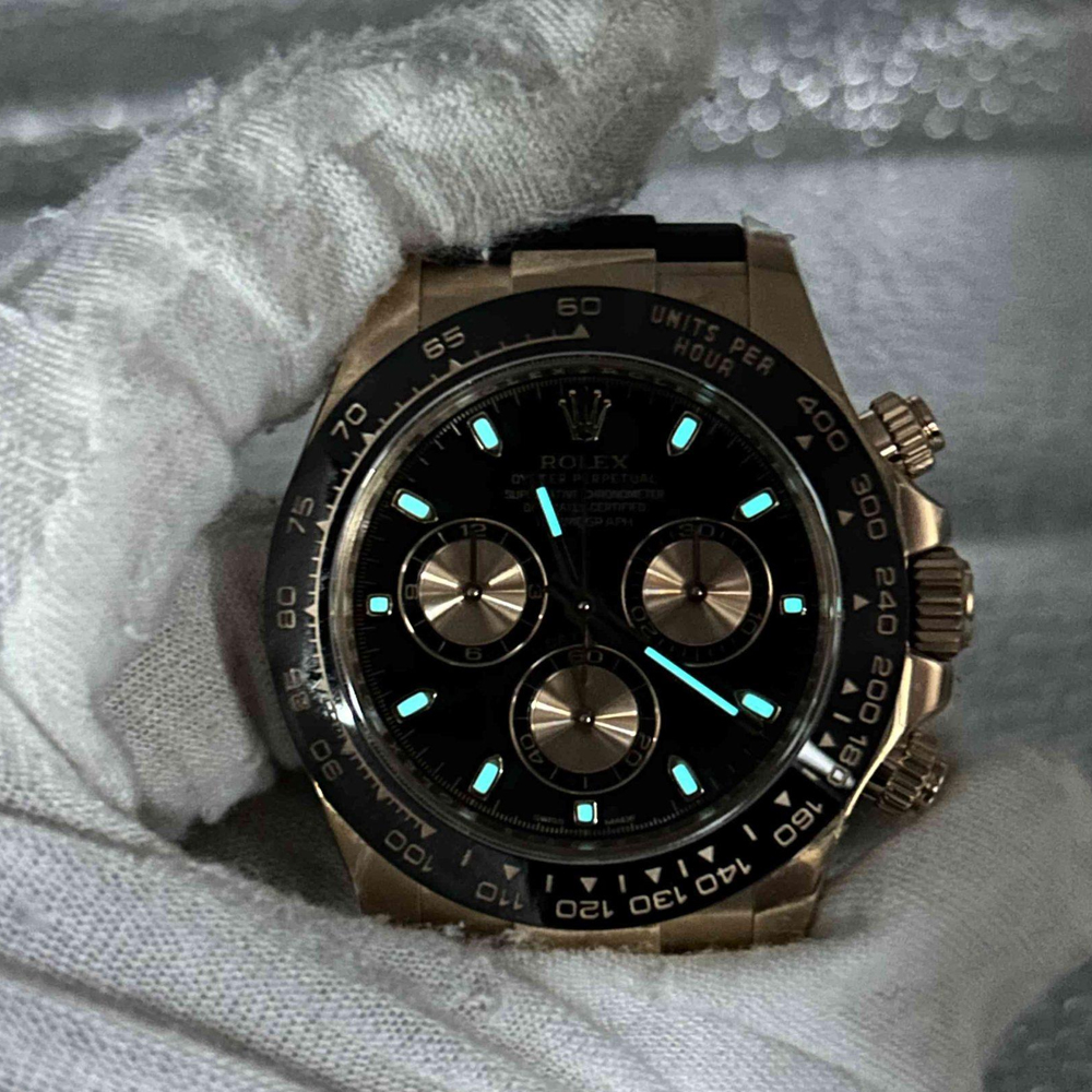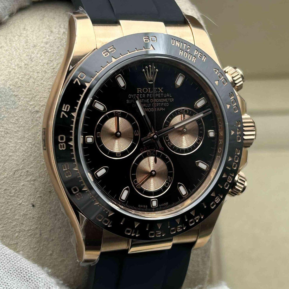 ベゼル:頑丈なブラックのモノブロック・セラミックベゼルが固定されており、タキメータースケールが刻まれています。数字と目盛りは18Kローズゴールドでコーティングされており、すべての細部においてオリジナルのロレックスデザインと一致しています。