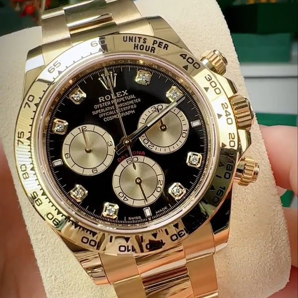 文字盤:このモデルは、ダイヤモンドがセットされたブライトブラック